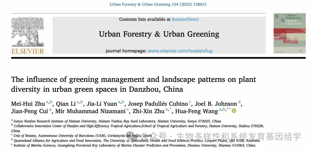 2024年12月,王华锋课题组在《Urban Forestry & Urban Greening》期刊(中科院一区TOP期刊,IF=6)发表题为“The Influence of Greening Management and Landscape Patterns on Plant Diversity in Urban Green Spaces in Danzhou, China” https://doi.org/10.1016/j.ufug.2024.128651的研究论文。海南大学硕士研究生朱美惠为该论文的第一作者,王华锋教授为论文的通讯作者。本研究得到国家自然科学基金的资助。儋州是我国热带城市生物多样性研究的重点区域,...