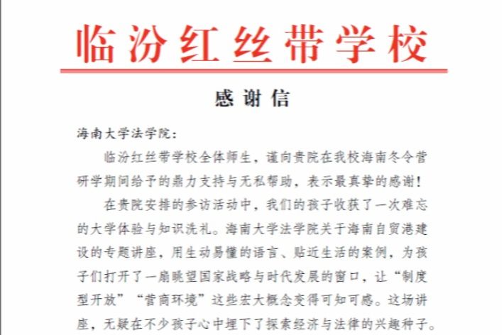 近日,法学院收到临汾红丝带学校全体师生发来的感谢信,信中对法学院为该校海南冬令营研学活动提供的鼎力支持、精心安排与无私帮助表示最诚挚的感谢。高度赞誉学院为孩子们打造了兼具知识深度与成长温度的研学体验,更对法学院展现出的学术担当、社会情怀与青春风采表达由衷敬佩。法学院将持续践行高校社会责任,秉持育人初心与公益情怀,以更多元的形式传递法治温度、播撒理想种子,为青少年成长成才贡献海大法学的智慧与力量。编辑:...