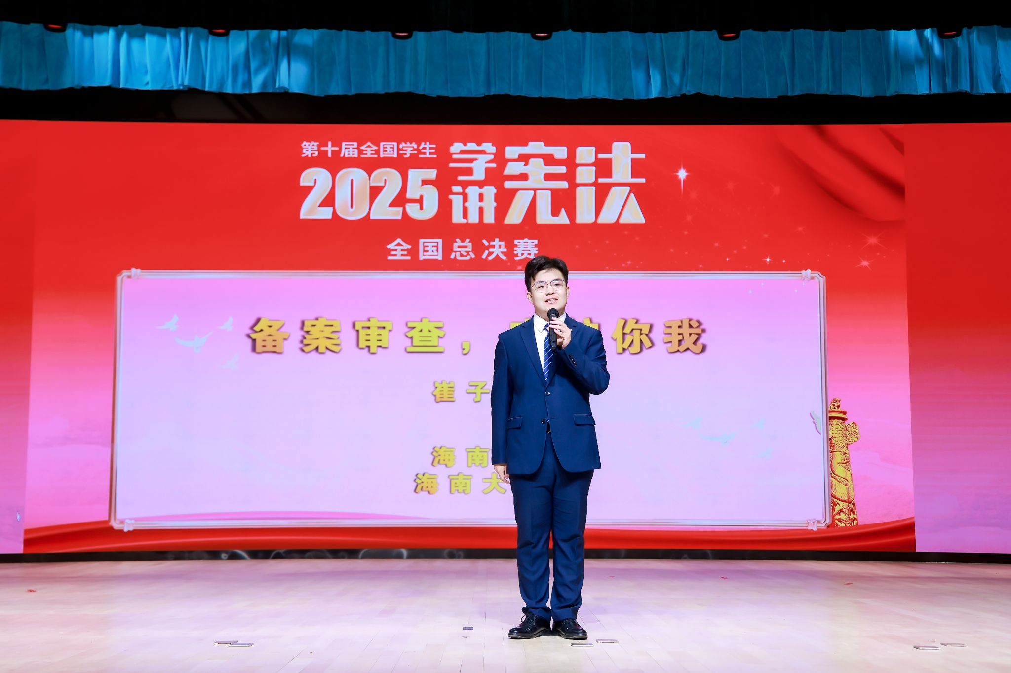 本站讯(通讯员 曹梦月 陈星宇)12月4日,在第十二个国家宪法日,海南大学紧紧围绕“学习宣传贯彻习近平法治思想,推动宪法深入人心”这一主题,组织开展了形式多样的法治宣传教育活动。现场展演照片上午,在北京举行的国家宪法日教育系统“宪法晨读”活动中,第十届全国学生“学宪法 讲宪法”演讲比赛高校组冠军、学校椰风书院、法学院国际法专业2024级本科生崔子恒以《备案审查,守护你我》这一获奖作品进行了现场展演。当天,各书院组织学生以集中与自主相结合的方式,...
