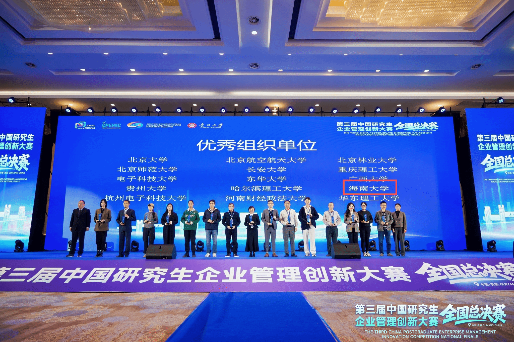 本站讯(通讯员 戚晓慧)2025年11月8日,第三届中国研究生企业管理创新大赛总决赛于贵州大学顺利结束。海南大学凭借出色的组织能力,荣获优秀组织奖,与北京大学、哈尔滨理工大学、电子科技大学等知名高校共同获此殊荣。海南大学MBA“三思智行队”,成功突围进入总决赛。