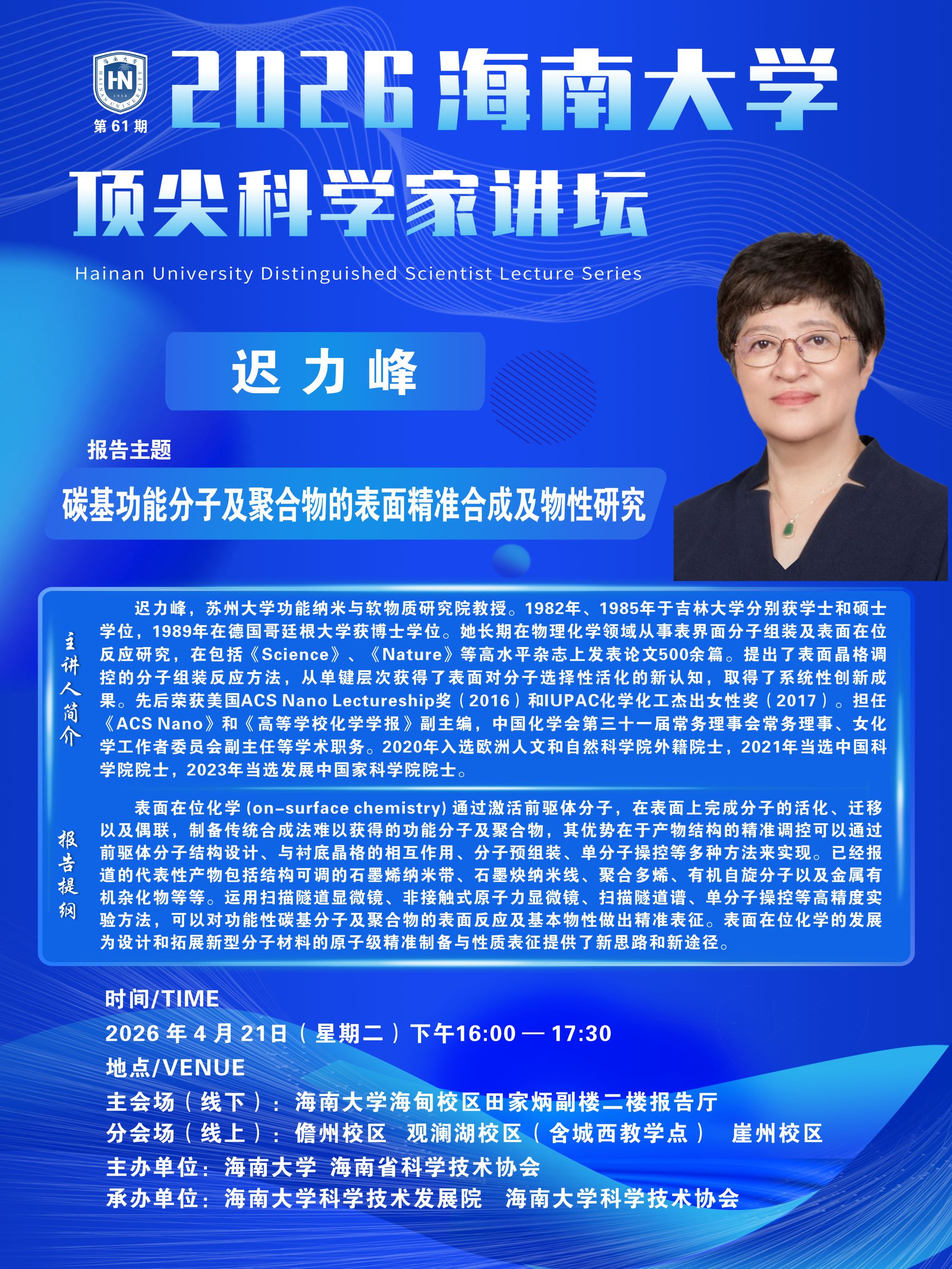 2026海南大学顶尖科学家讲坛 | 碳基功能分子及聚合物的表面精准合成及物性研究