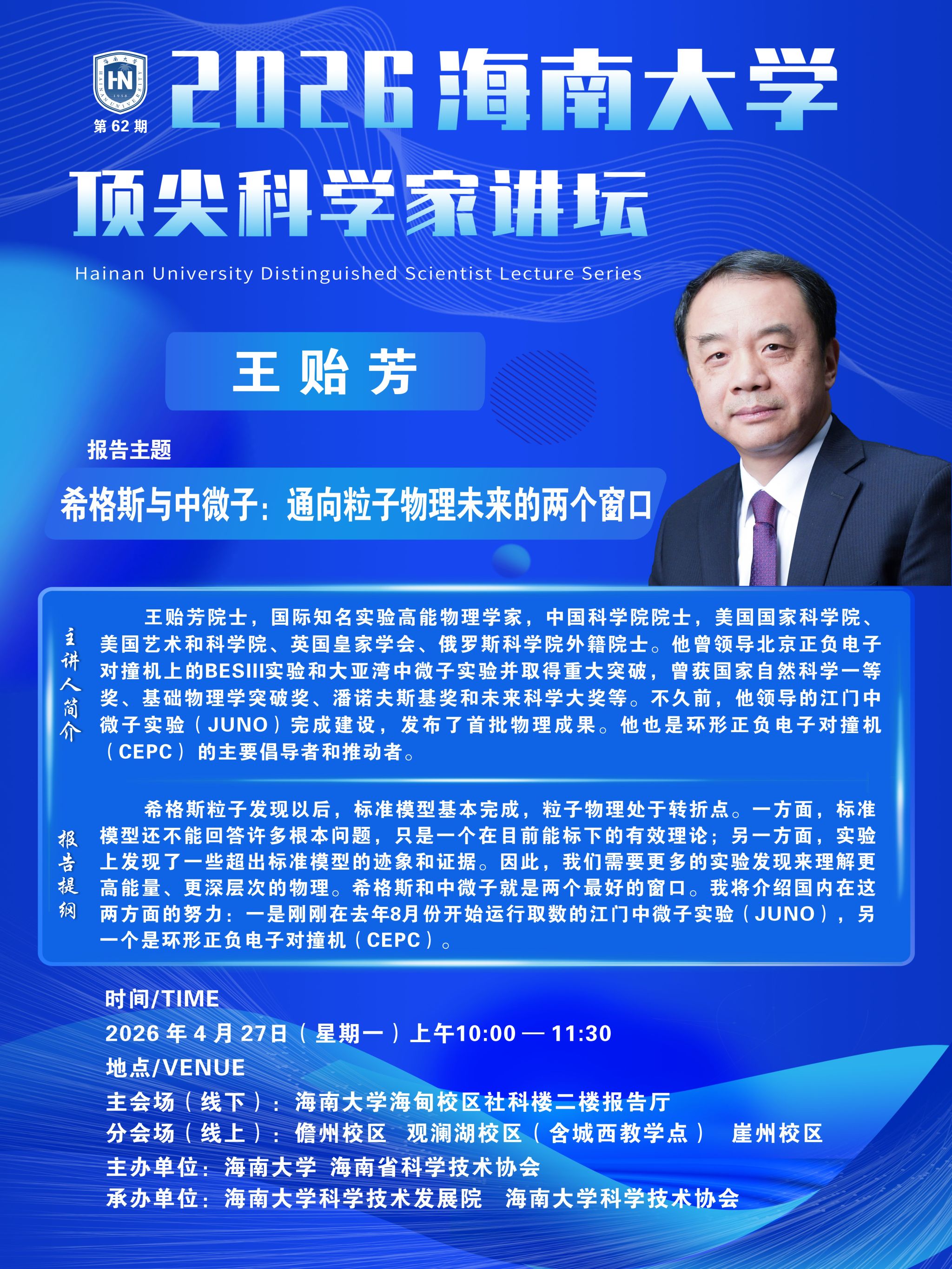 2026海南大学顶尖科学家讲坛 | 希格斯与中微子:通向粒子物理未来的两个窗口