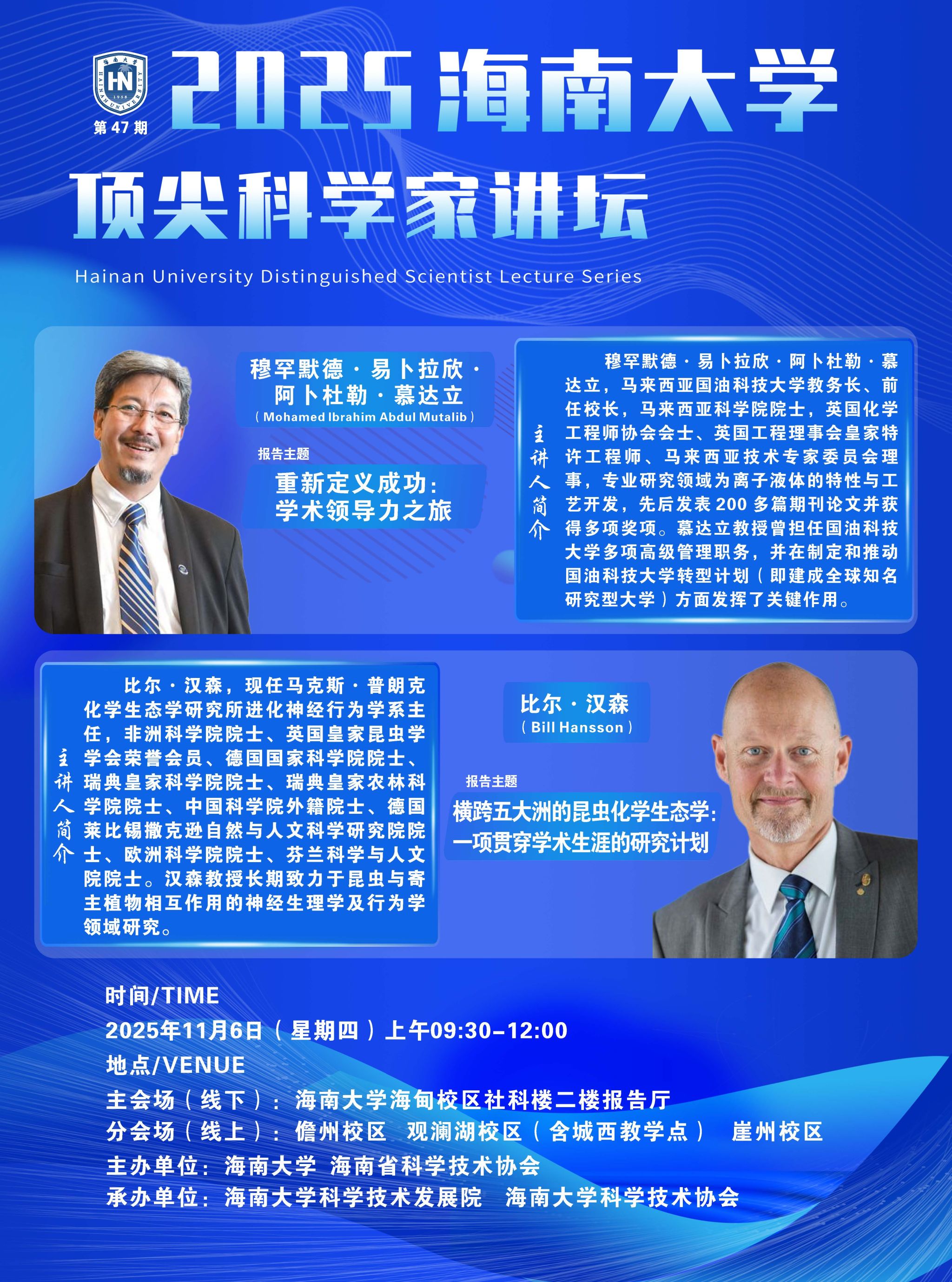 “海南大学顶尖科学家讲坛”致力于开拓学校师生的国际学术视野,增加师生与世界学术大师近距离接触的机会,聆听各学科领域最前沿的声音,促进相关学科国际交流与建设,培养师生的家国情怀、科学兴趣和创新思维,为学校与国际学术界搭建交流的桥梁。